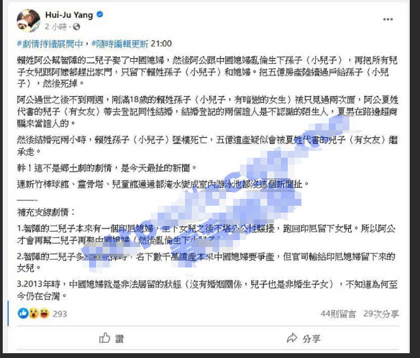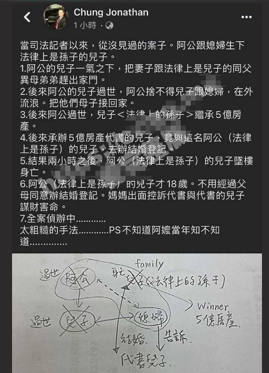 台湾大瓜 爷爷与儿媳扒灰生子 儿子继承爷爷五亿房产 与代理律师儿子同性闪婚后 2 小时坠楼身亡