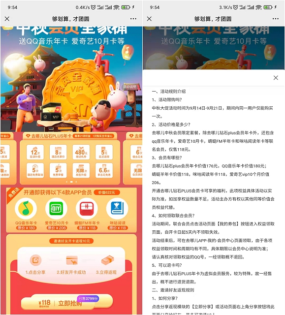 手机打开链接进入活动 118元开通去哪儿联合会员 赠送绿钻年卡、10个月爱奇艺会员、蜻蜓FM半年卡、咪咕阅读