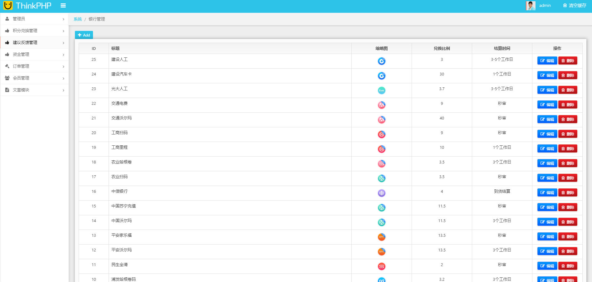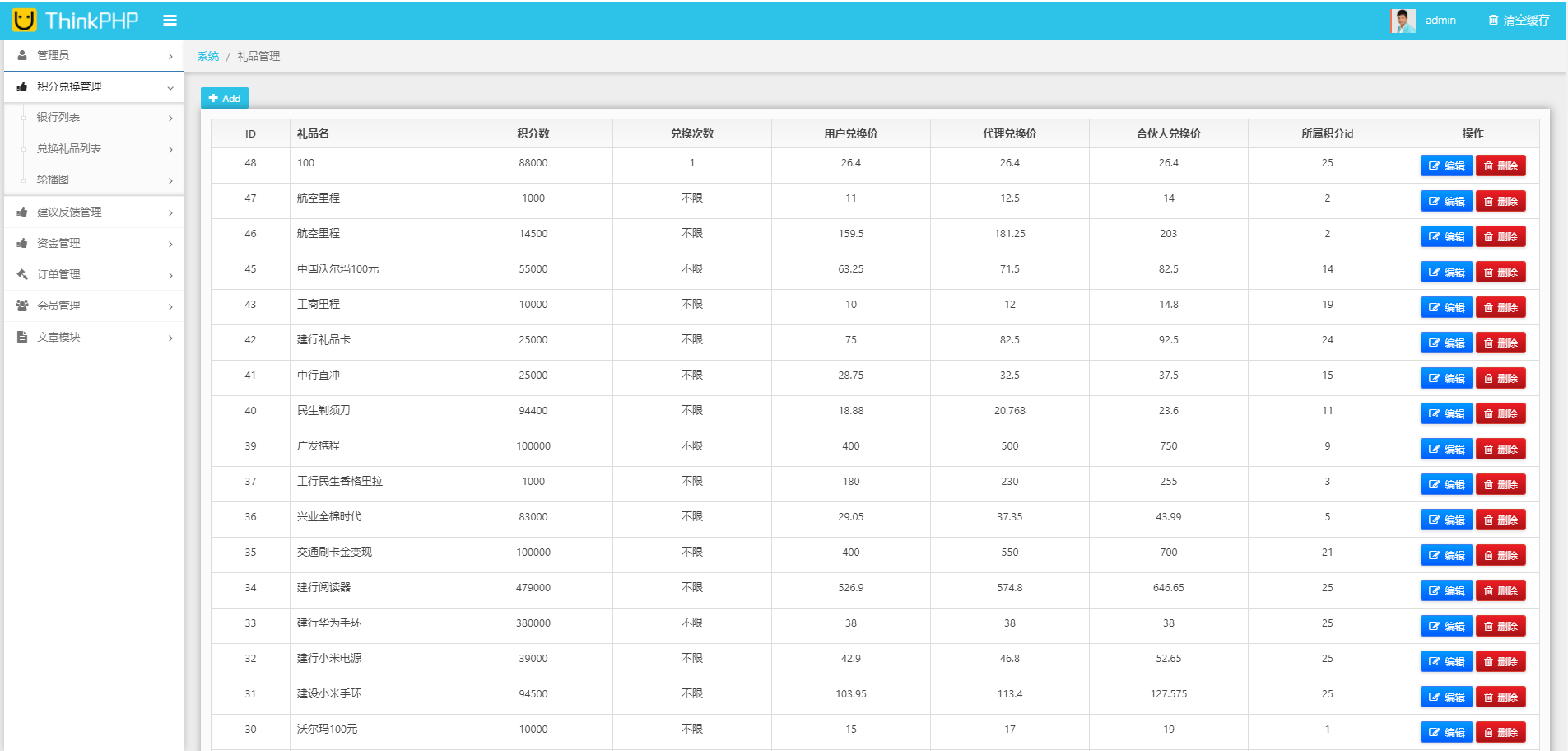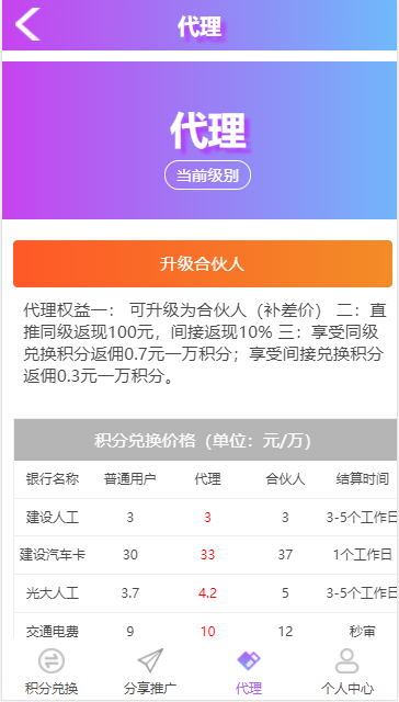 系统支持添加多个银行积分兑换,添加单独银行兑换商品,支持设置用户价-代理价-合伙人价