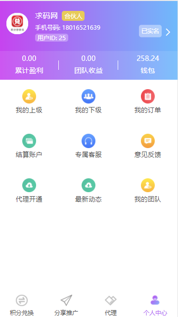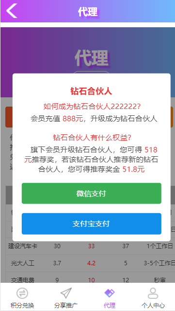 系统自带推广功能,支持自助开通合伙人功能(默认对接码支付)