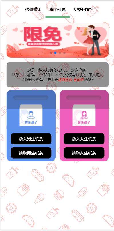 开启收费开启盲盒 投放付费 条件筛选付费!可设置付费购买代理(代理就是摊主红娘)