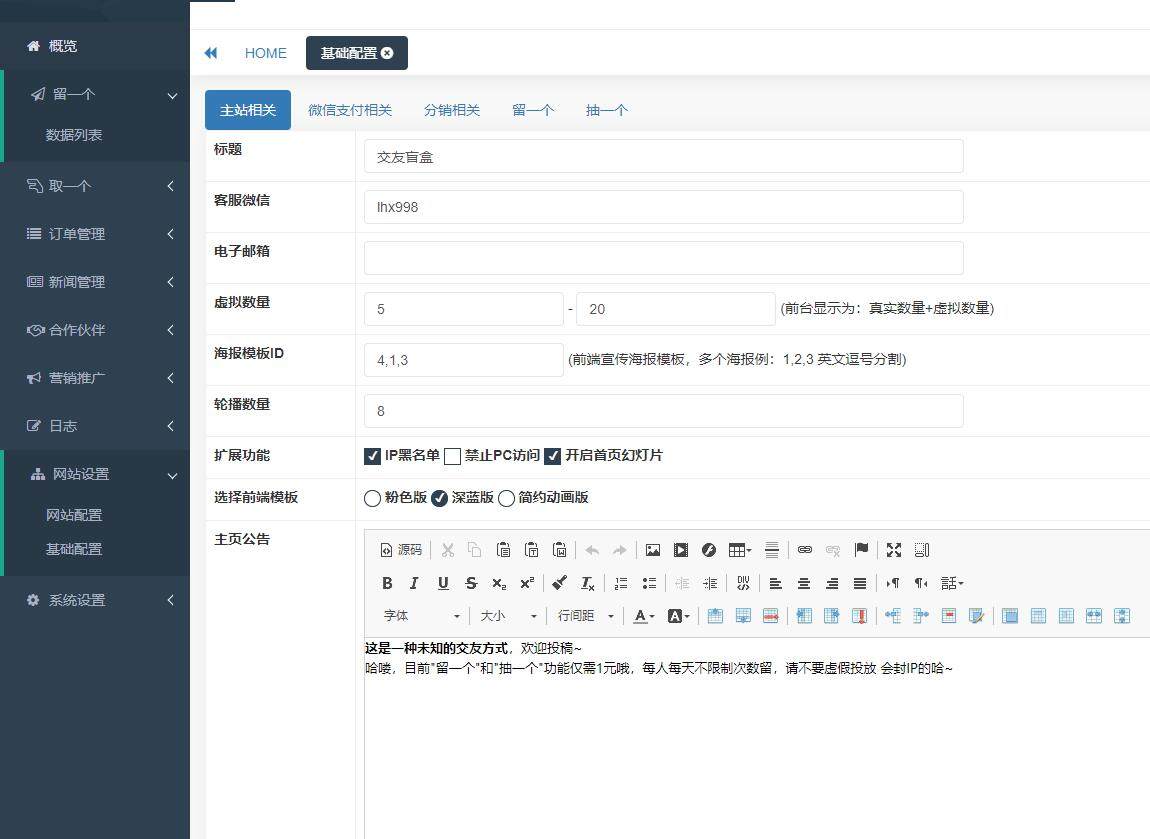 网站配置为网站基本信息:标题、SEO信息、统计代码等,基础配置可以设置站点的所有基本信息