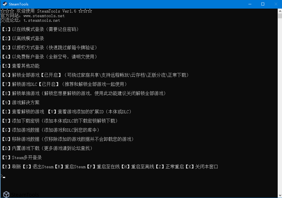 【E】刷新【S】退出Steam【R】重启Steam【F】重启至在线【H】重启至离线【Z】正常重启【X】关闭本窗口
