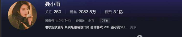 聂小雨,出生于 1995 年 9 月 28 日,是抖音直播平台网络红人,创作内容以汽车、娱乐为主。 截至 2023 年 5 月 29 日,抖音粉丝数达 2087 万人,在抖音发布作品 452 个,获赞量 3 亿次。