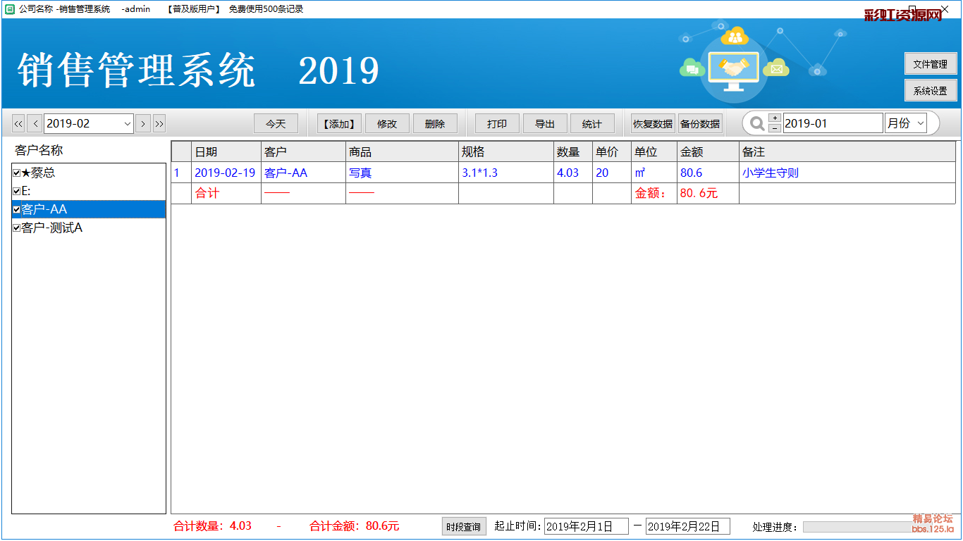 自用销售管理记录软件。支持cha询、修改、打印、导出等功能