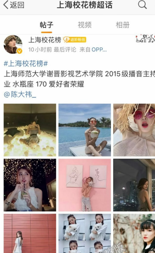 本期内容来自一位拥有着神仙颜值的小姐姐,小姐姐名叫 陈祎 ,来自 上海师范大学 谢普影视艺术学院 的 2015 级播音主持专业,微博名为 陈大祎,水瓶座 身高足足 170,也是一位王者荣耀爱好者哦。不过目前其微博账号、抖音账号均已私密。其颜值在瓜农看来绝对能和警花张津瑜不相上下!同时也上了上海校花榜超话哦,得到了不少人的认可,不知道是多少人心中的白月光,真遗憾通过