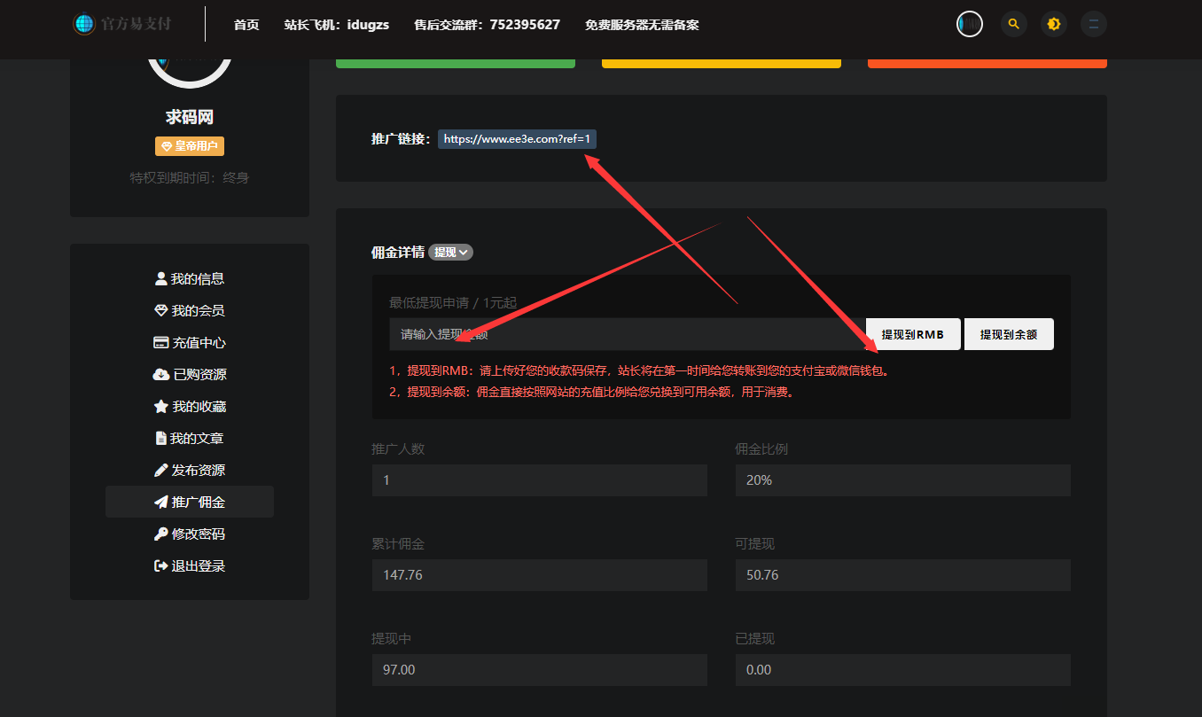 每个人有自己的推广连接。别人付款后。会抽取百分之20的佣金作为提成。每个人都可以作为代理推广本网站。快召唤你有能力的小伙伴一起赚钱吧~