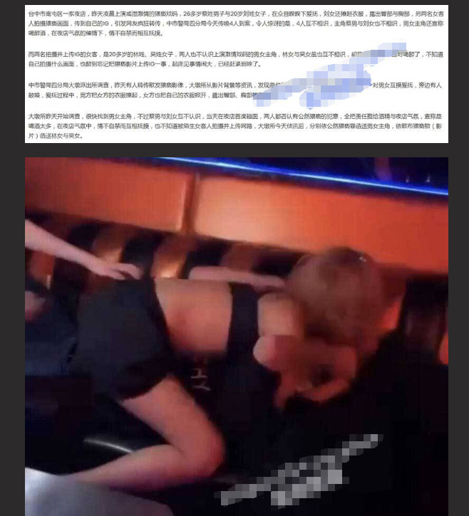 台中市南屯区一家夜店,昨天凌晨上演咸湿激情的猥亵戏码,26 多岁蔡姓男子与 20 岁刘姓女子,在众目睽睽下爱抚,刘女还撩起衣服,露出臀部与胸部,另两名女客人拍摄猥亵画面,传到自己的 IG,引发网友疯狂转传,中市警局四分局今天传唤 4 人到案,令人惊讶的是,4 人互不相识,主角蔡男与刘女也不相识,男女主角还宣称喝醉酒,在夜店气氛的催情下,情不自禁而相互抚摸。
