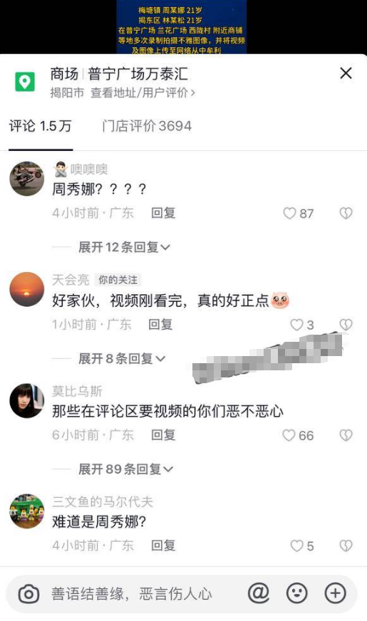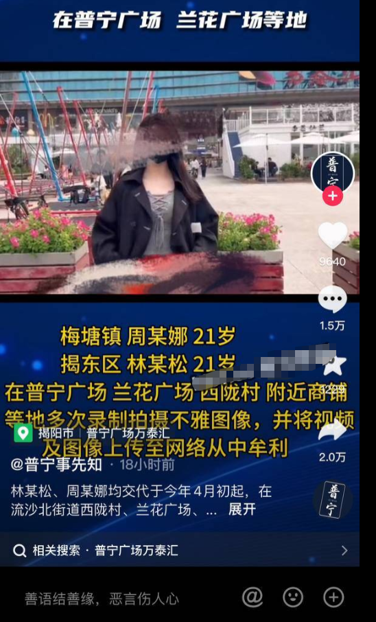 近日,随着抖音普宁官方帐一则关于周某娜,林某松等人在普宁广场,兰花广场,西陇村附近商铺等地多次拍摄 图像,并将视频及图像上传至网络牟利的视频,普宁广场事件也随之在抖音上爆火,并且眼尖的网友随之指出,此周某娜就是周秀娜~并且家庭住址都已经被吃瓜着魔的网友给扒出来了,这次周某娜不对周秀娜已经算是彻底社死了~