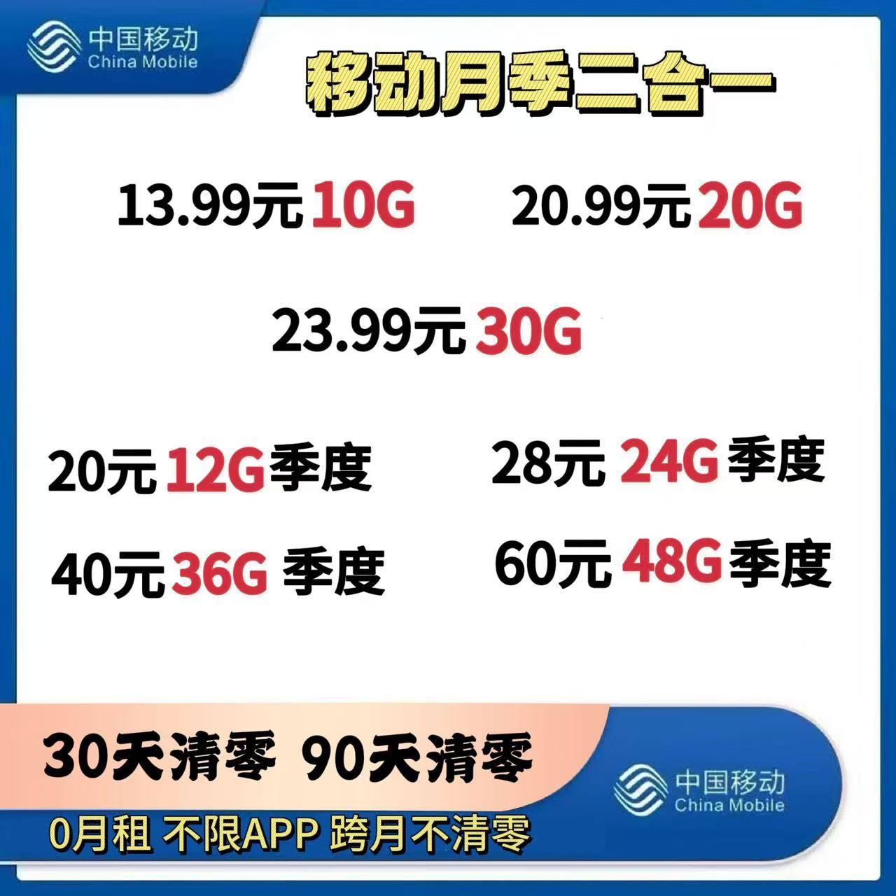 移动/广电卡:月卡/季卡 /月底清0/30天清0