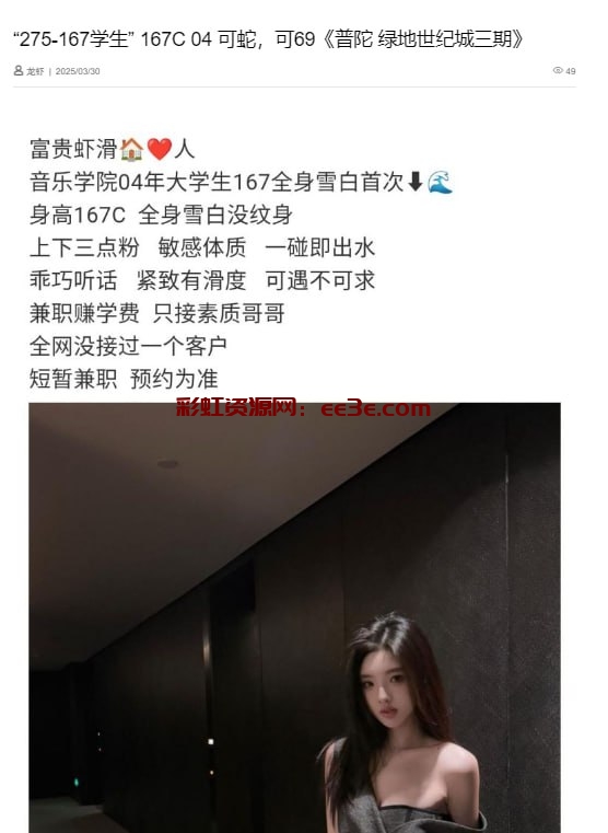 类型:音乐学院04年大学生、全身雪白、没纹身、上下三点粉、敏感体质、一碰即出水、乖巧听话、紧致有滑度、可遇不可求兼职赚学费、只接素质哥哥全网没接过一个客户短暂兼职、预嬳为准