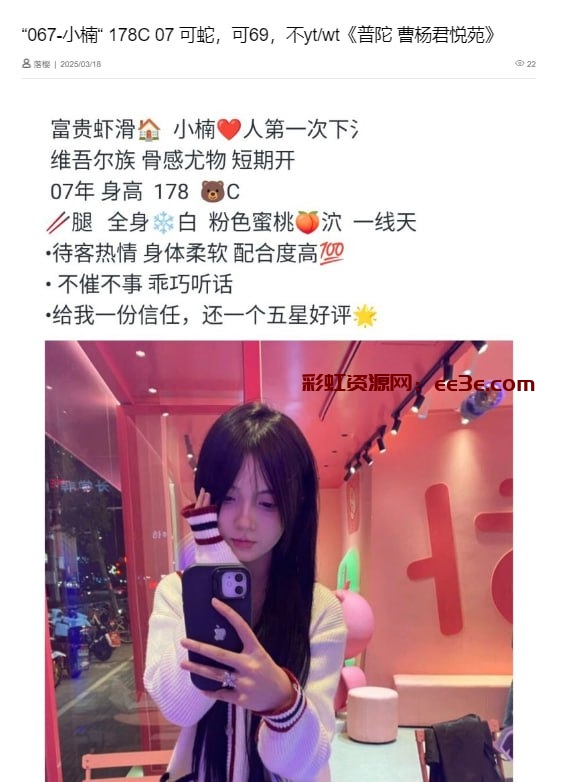 类型:新人第一次下氵维吾尔族、骨感尤物、短期开、全身素白、粉色蜜桃、 一线天、待客热情、身体柔软、配合度高心不催不事、乖巧听话、给我一份信任、还一个五星好评